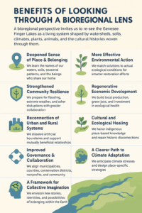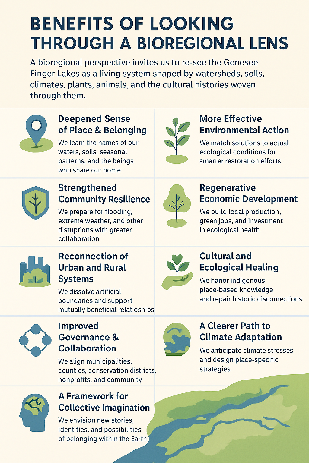 Looking through a bioregional lens also strengthens regional food systems, reconnecting people to the farms, forests, fisheries, and soils that nourish them. This awareness naturally leads to enhanced water literacy, as people begin to understand their watershed from ridge to river to lake. With this comes clearer stewardship of rivers, streams, wetlands, and aquifers.